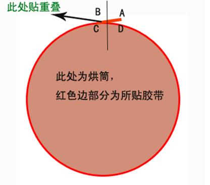 5. 貼好鐵氟龍膠帶后細心反省膠帶與烘筒之間能否有小氣泡,若有,可以用大頭針之類的尖細物逐個掃除小氣泡,并抺平。B處膠帶,撕失落C處的膠帶,最終貼好B處,將B處和D處的膠帶抺平即可。